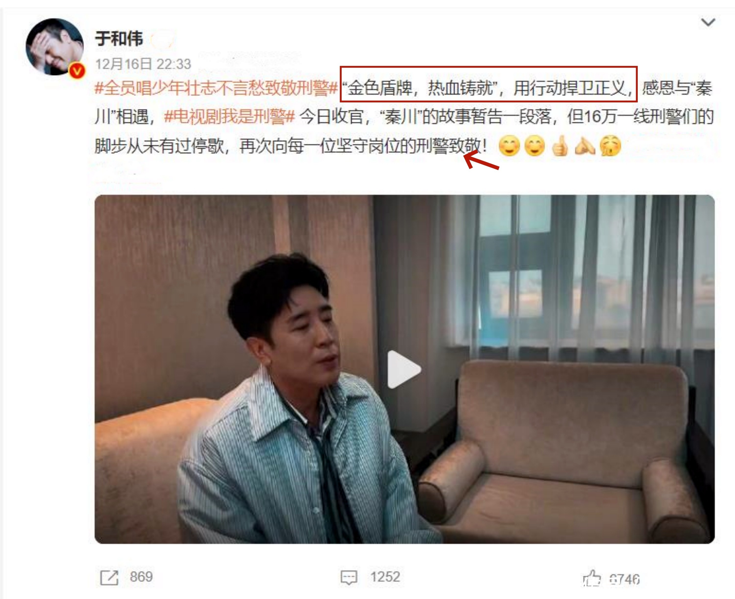 于和伟亲自录视频,清唱了一首《少年壮志不言愁》,致敬人民警察。